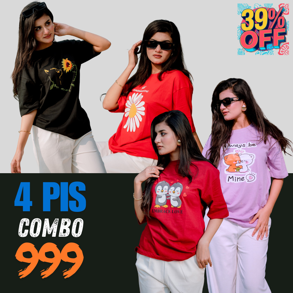 ৪ পিস টি-শার্ট কম্বো ৯৯৯ টাকা (Flower Red / Always Purple / Embrance Love Merun / Daisy Cat Black)